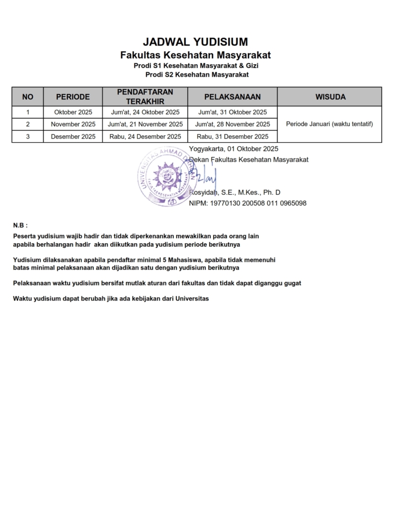 Diumumkan kepada mahasiswa Fakultas Kesehatan Masyarakat bahwa jadwal yudisium terbaru sebagai berikut: